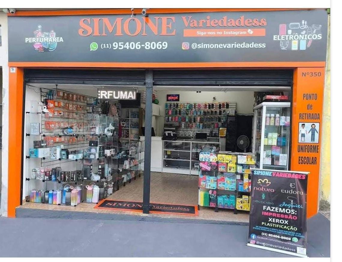 A Loja SIMONE VARIEDADESS traz uma extensa gama de produtos eletrônicos, de papelaria e cosméticos, encantando seus clientes com a diversidade e inovação. Com mais de uma década de experiência no mercado, a SIMONE VARIEDADESS se destaca por oferecer variedades únicas e exclusivas para seus clientes, sempre buscando surpreender com as últimas novidades. Venha nos visitar na Rua Marechal Vieira Peixoto, N° 350, e descubra um universo de opções. Entre em contato pelo telefone 11954068069 ou pelo e-mail simonevariedadessv@gmail.com. Estamos aqui para você de segunda a sábado, das 9:00 hs às 19:00hs.